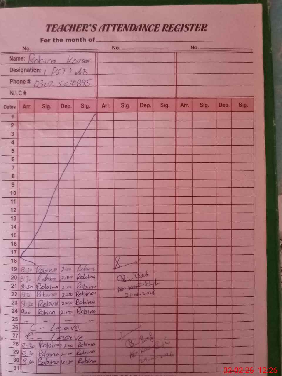 | Name: RI**** SH**** Designation: (School Headmaster's/Headmistress's) PST Phone/Cell Number: 03**** |