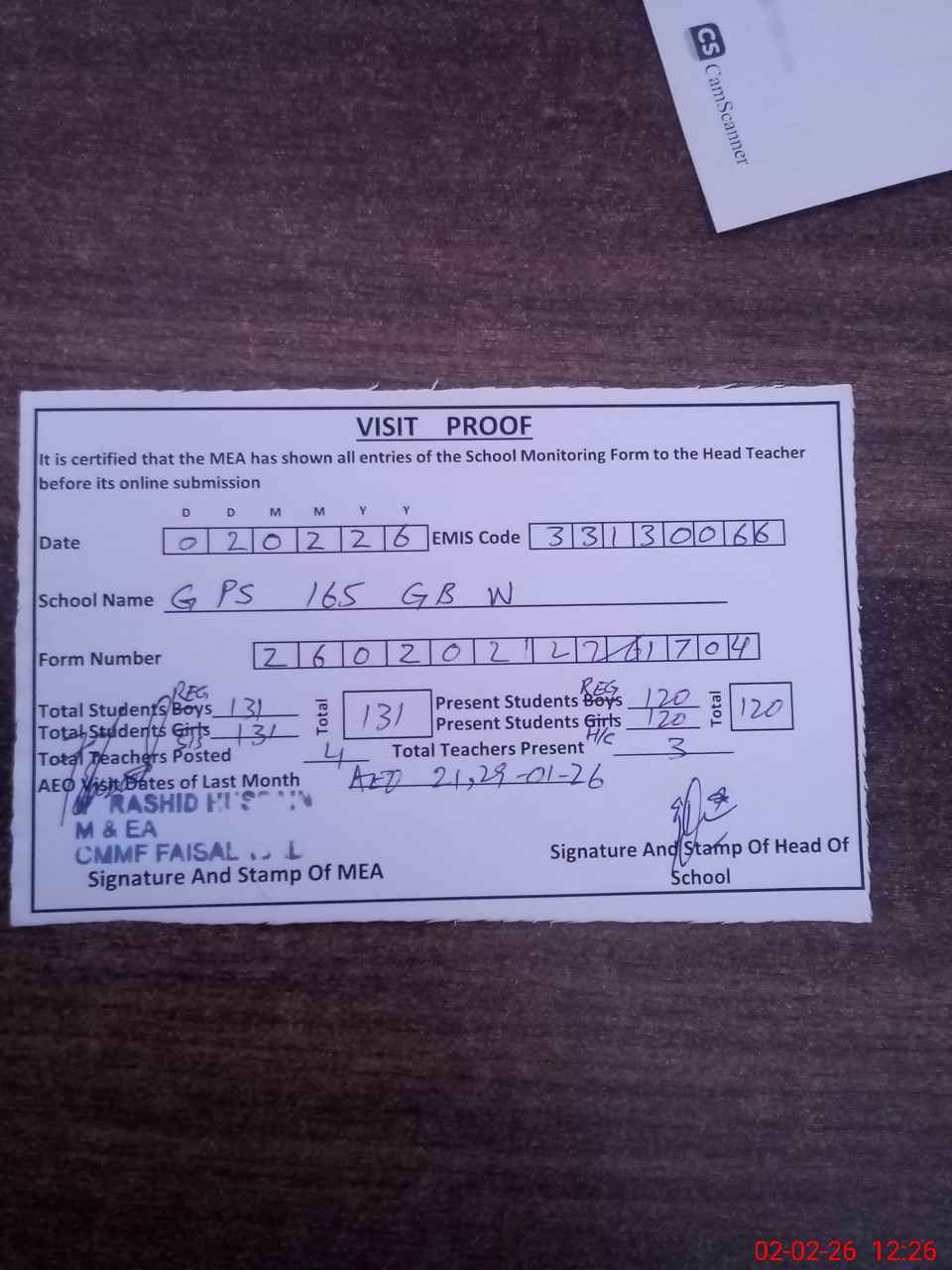| Attendance Register | Head Teacher | MEA with School | Visit Proof |