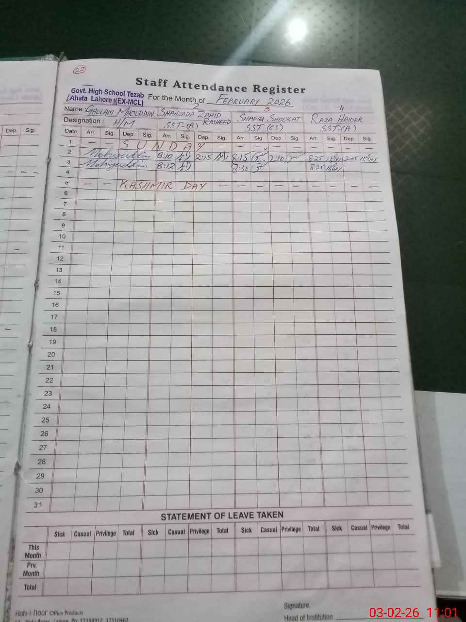 | CNIC | Full Name | Designation | R/C | Absence During Last Calender Month |