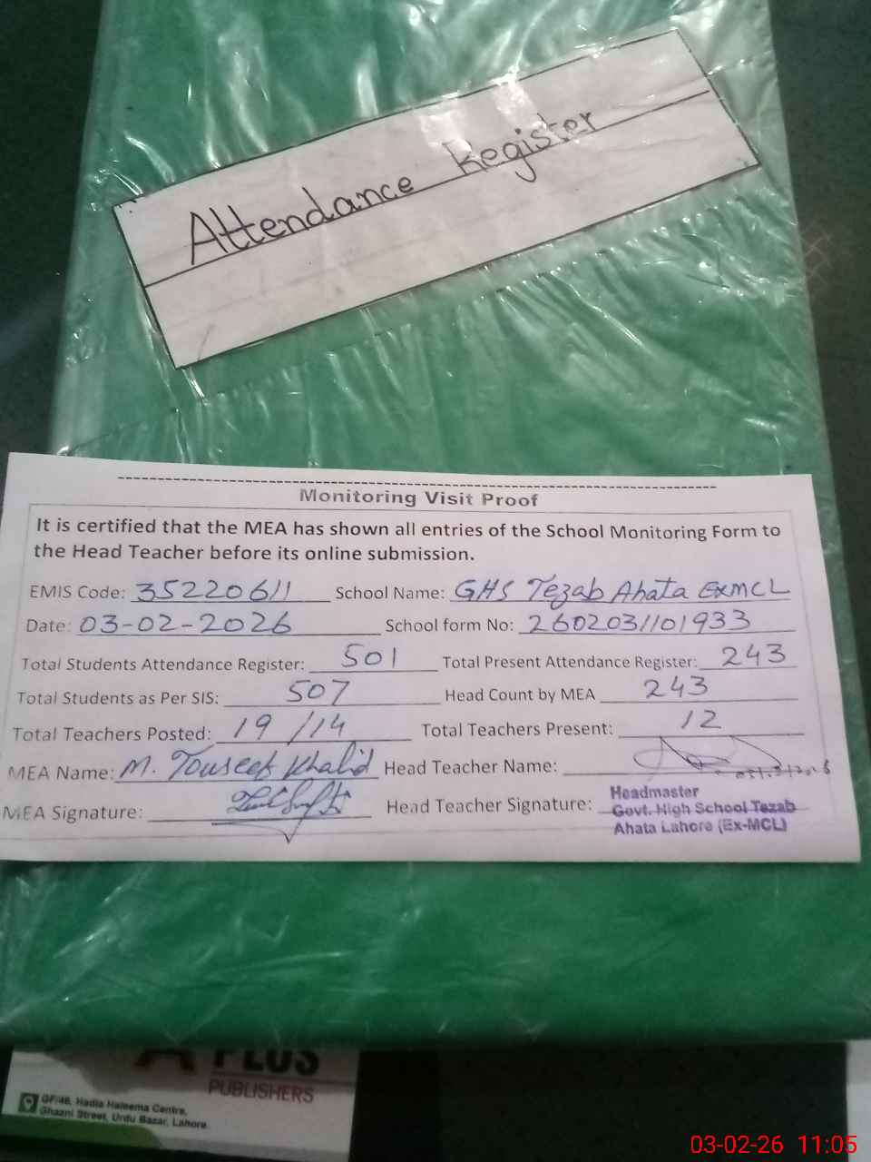 | Attendance Register | Head Teacher | MEA with School | Visit Proof |