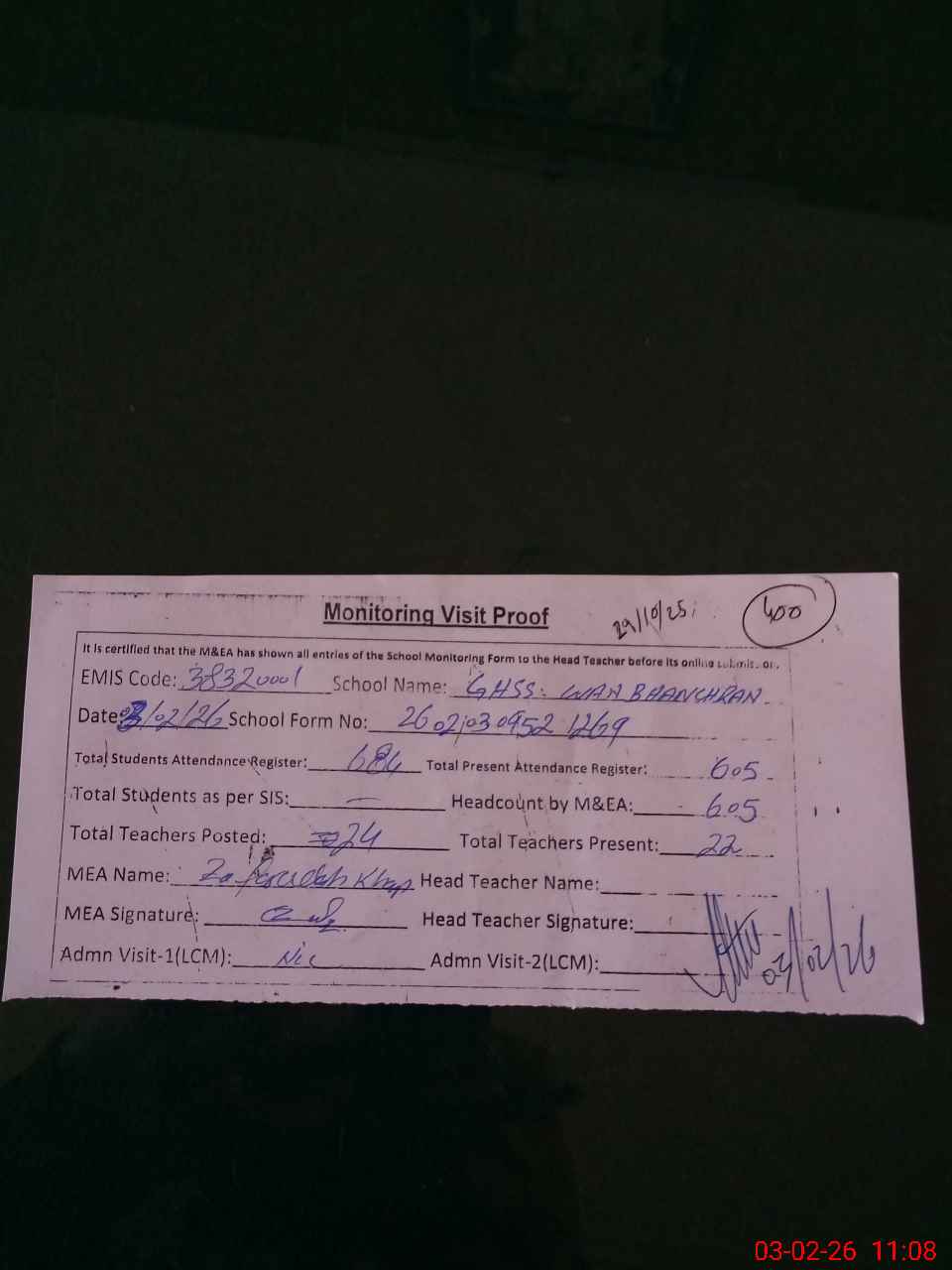 | Attendance Register | Head Teacher | MEA with School | Visit Proof |