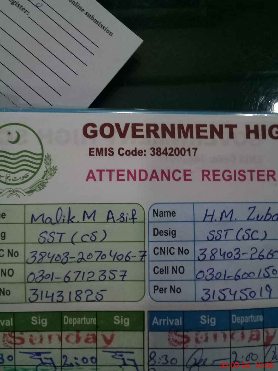 | CNIC | Full Name | Designation | R/C | Absence During Last Calender Month |