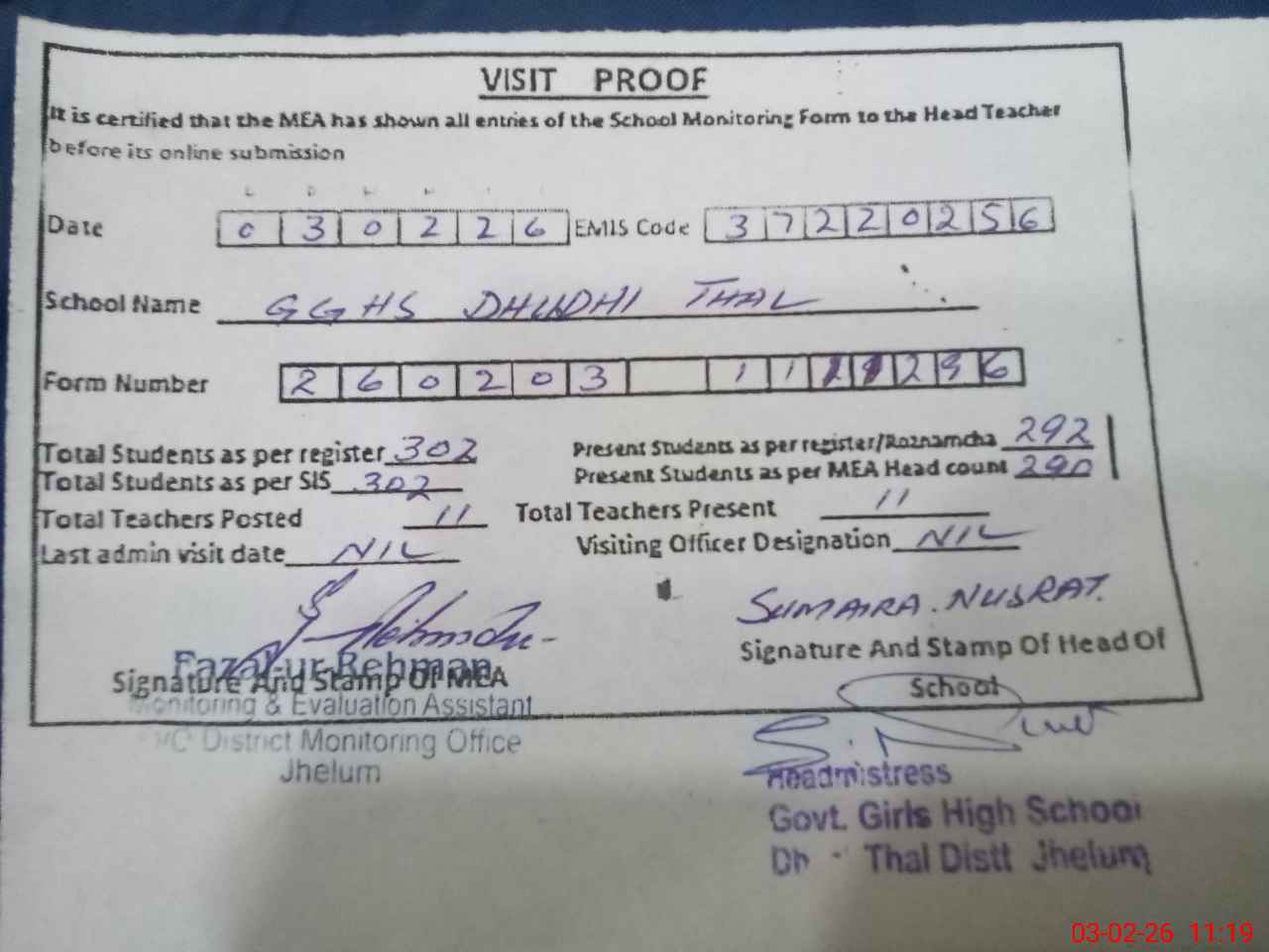 | EMIS Code: 37220256 | Name of School: GGHS DHUDHY THALL | |||
