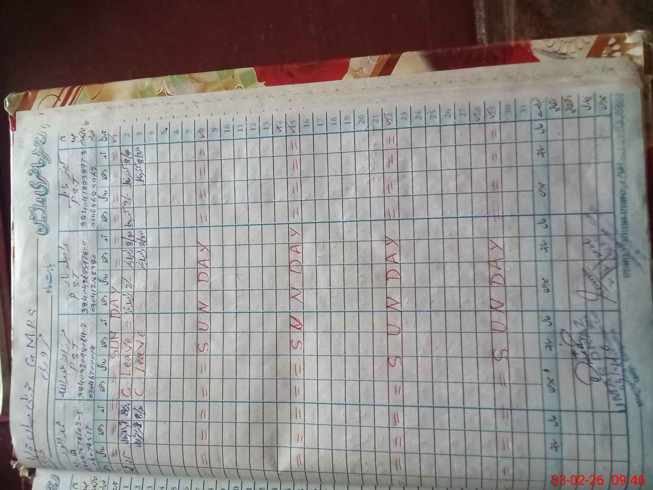 | CNIC | Full Name | Designation | R/C | Absence During Last Calender Month |