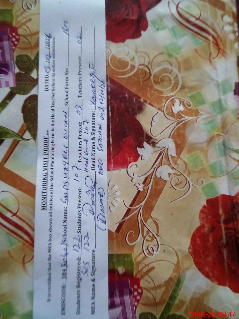 | Attendance Register | Head Teacher | MEA with School | Visit Proof |