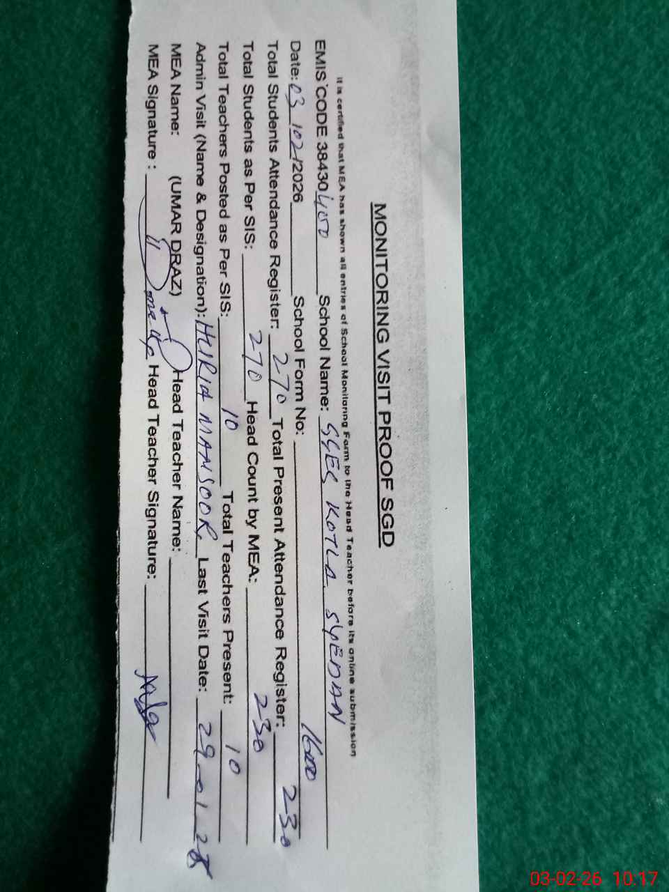 | Attendance Register | Head Teacher | MEA with School | Visit Proof |