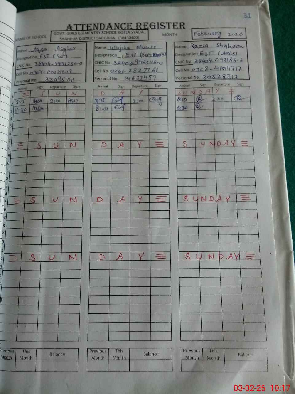 | CNIC | Full Name | Designation | R/C | Absence During Last Calender Month |