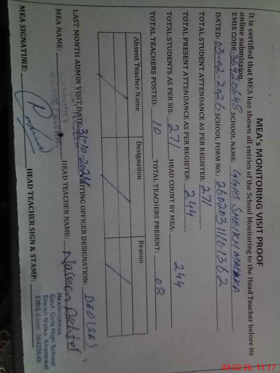 | Attendance Register | Head Teacher | MEA with School | Visit Proof |
