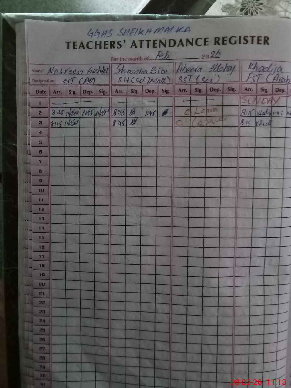 | CNIC | Full Name | Designation | R/C | Absence During Last Calender Month |