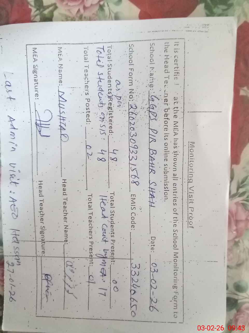 | EMIS Code: 33240650 | Name of School: GGPS PIR BAHR SHAH | |||