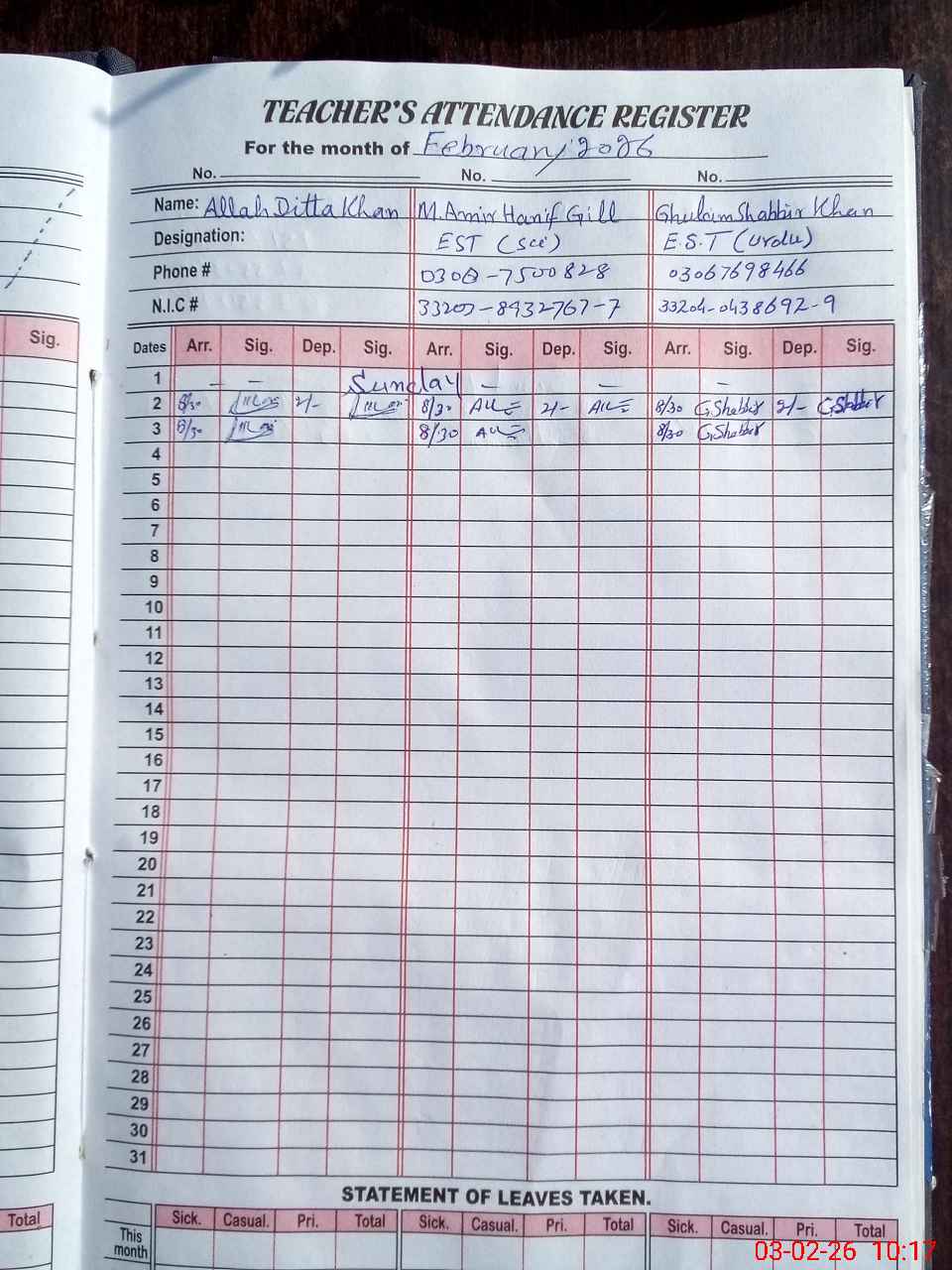| CNIC | Full Name | Designation | R/C | Absence During Last Calender Month |