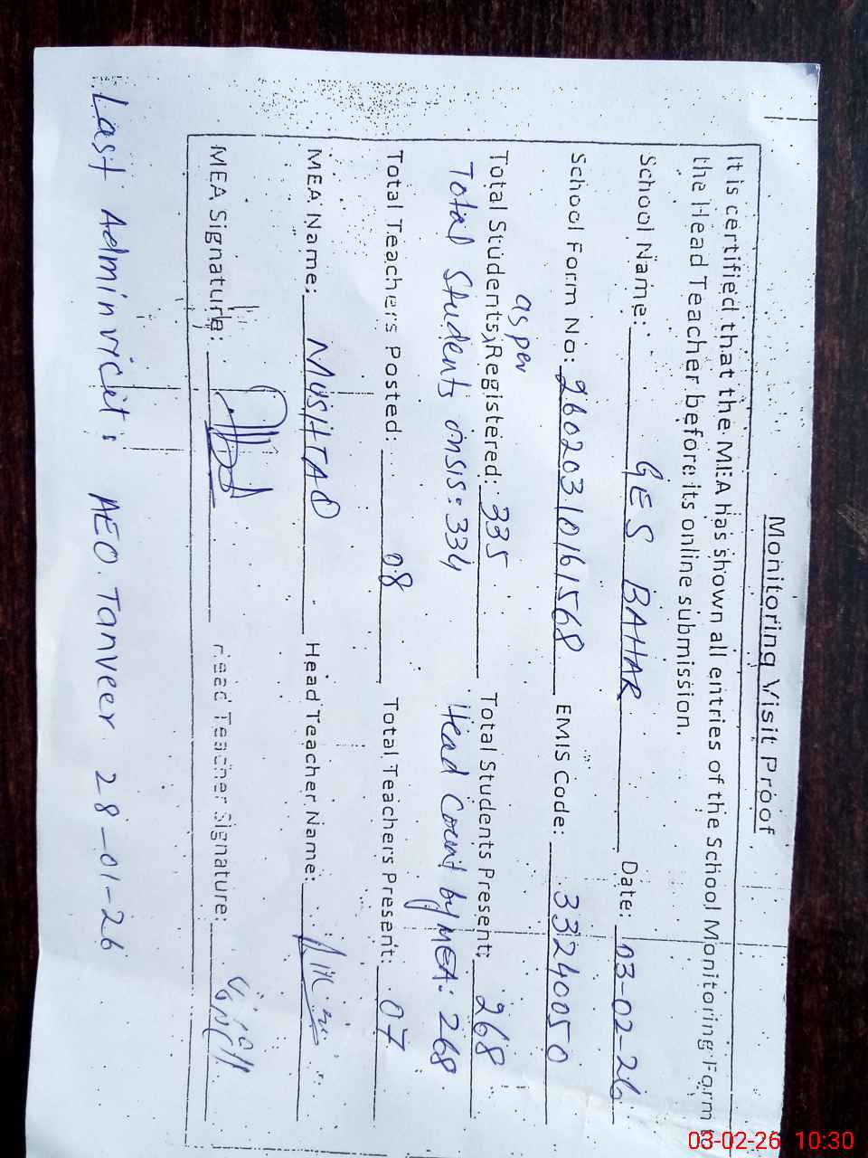 | Certified that this School was Inspected by the Undersigned MEA/DMO Today and the Information Stated Above is as Per Record. | |||||