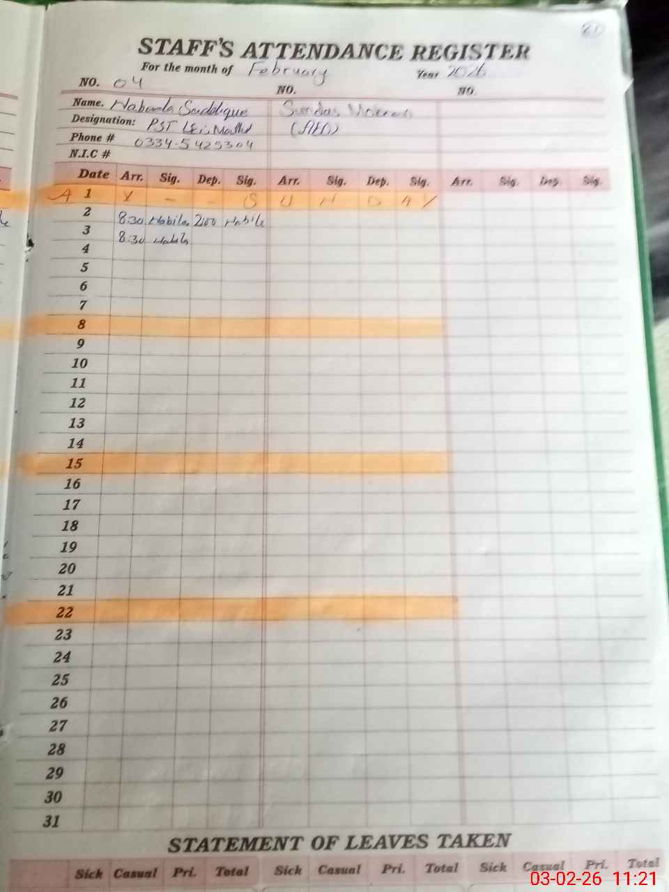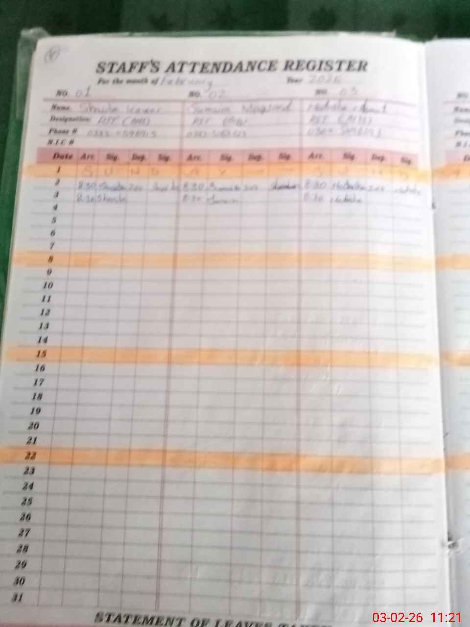 | CNIC | Full Name | Designation | R/C | Absence During Last Calender Month |