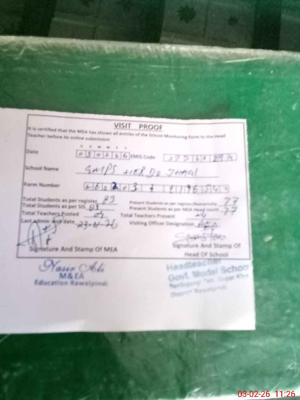 | Attendance Register | Head Teacher | MEA with School | Visit Proof |