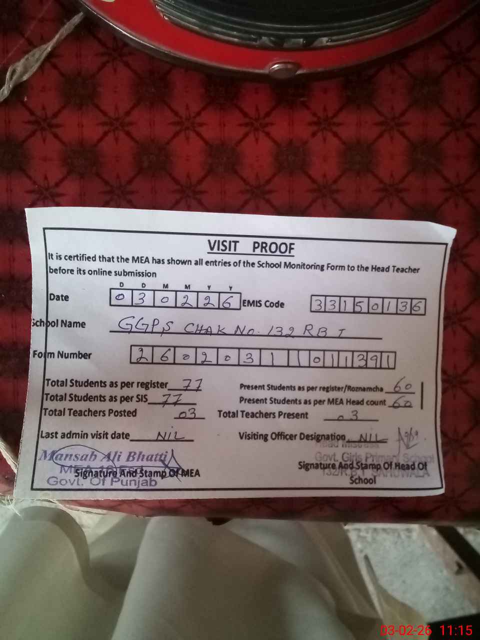 | Attendance Register | Head Teacher | MEA with School | Visit Proof |