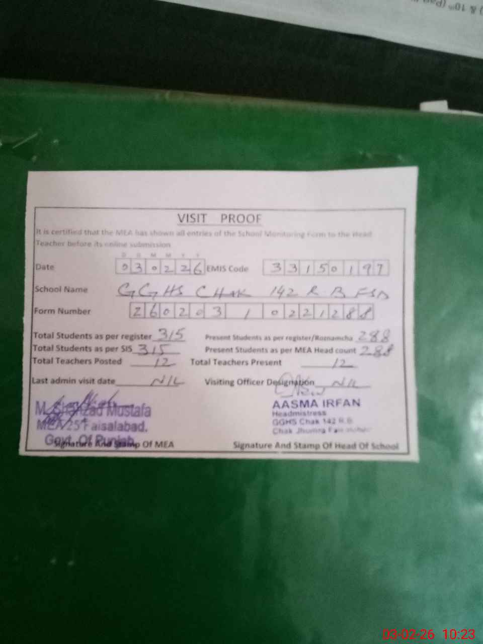 | EMIS Code: 33150197 | Name of School: GGHS CHAK NO 142 RB | |||