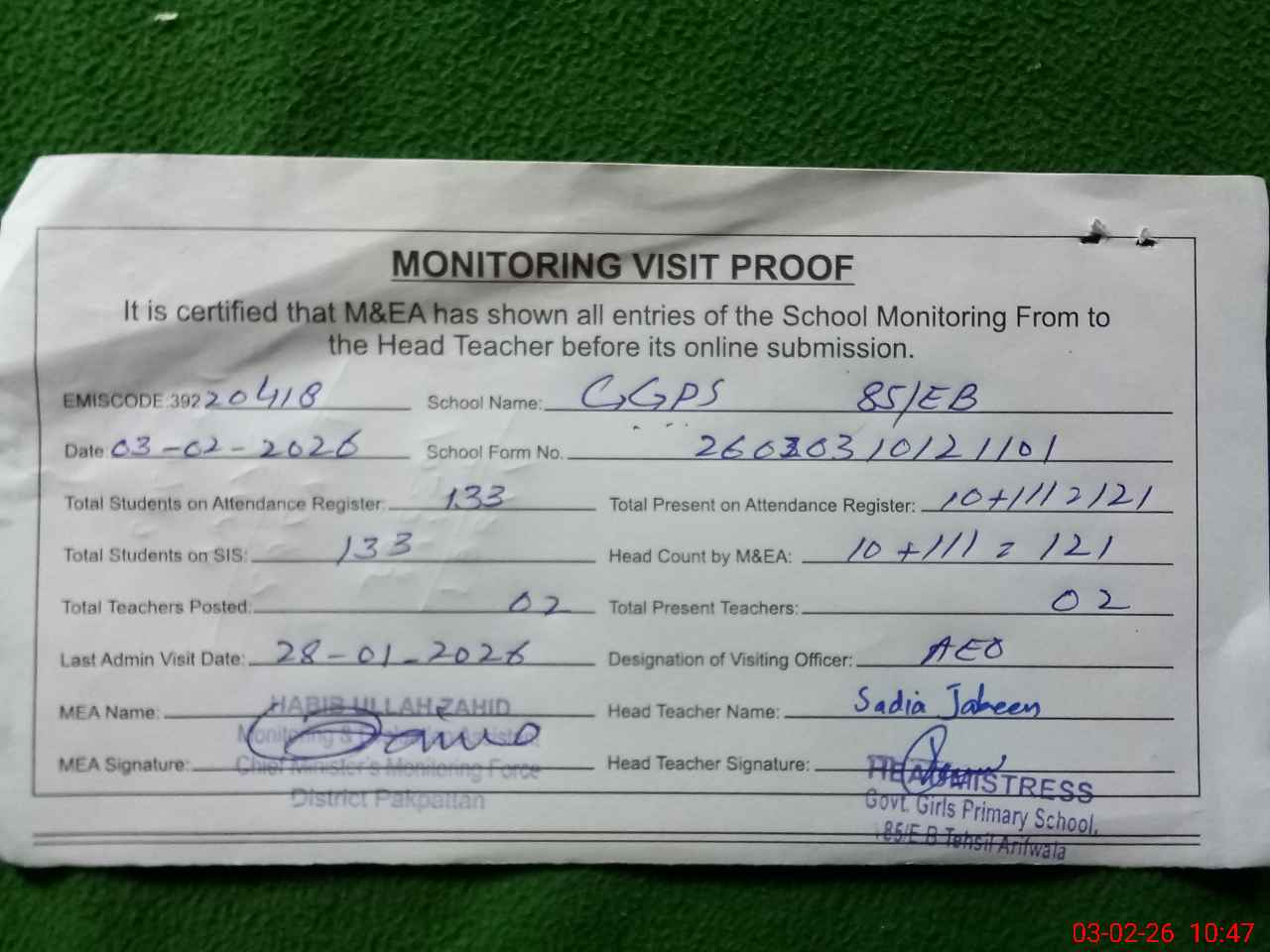 | Monitoring Date: 03-02-2026 | Start Time: 03-02-2026 10:03 AM | End Time: 03-02-2026 10:47 AM | Name of MEA: Ha**** Ul**** Ur**** Ba**** Al**** | |