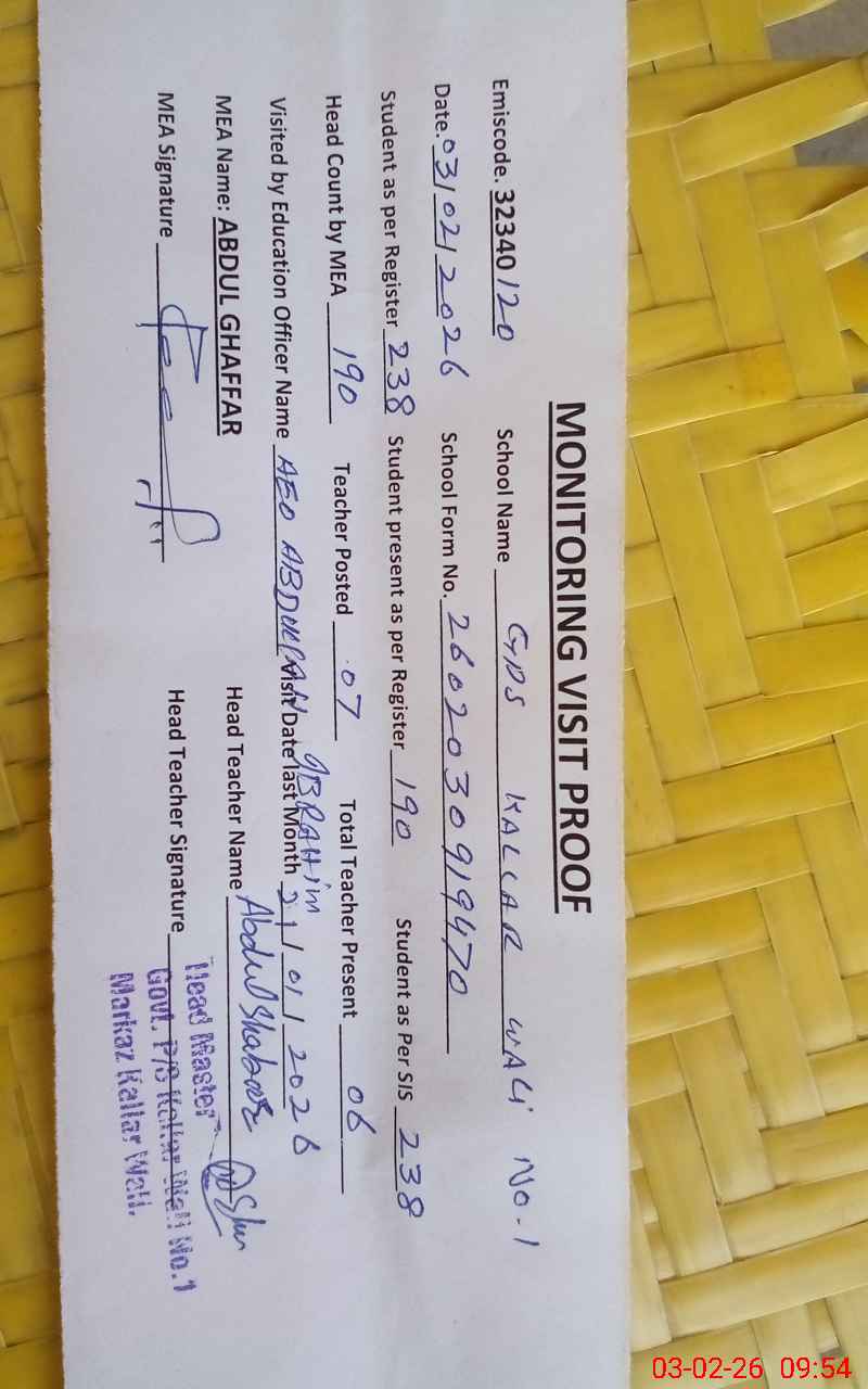 | EMIS Code: 32340120 | Name of School: GPS KALLAR WALI NO.1 | |||