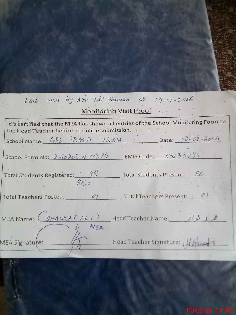 | EMIS Code: 33230295 | Name of School: GPS BASTI ISLAM | |||
