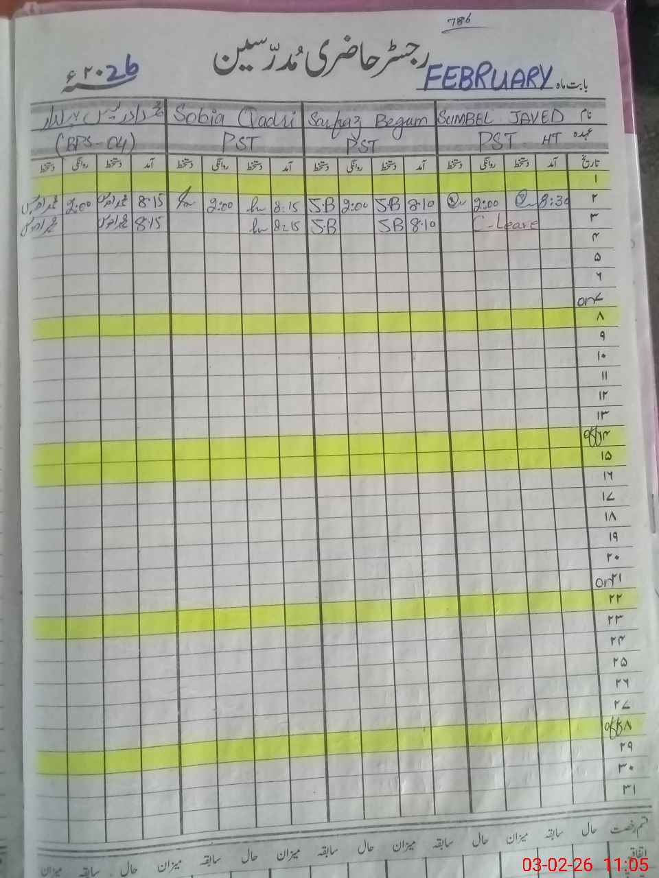 | Remarks (Use Separate Page if Required): Head teacher Sumbel Javed is marked absent today as approved casual leave is not available NSB and FTF record registers are not maintained for the last month | |||||