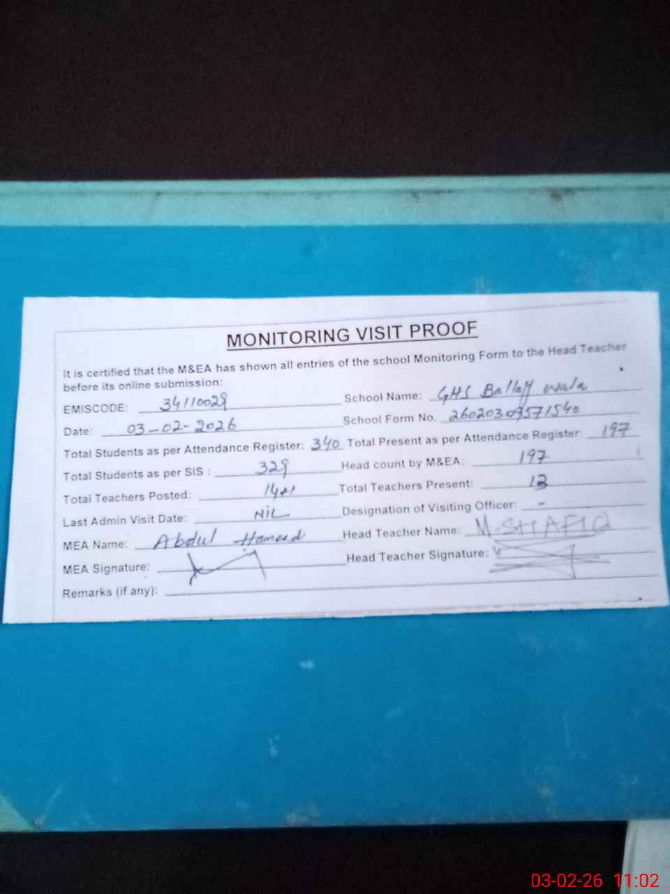 | Remarks (Use Separate Page if Required): 2nd portion of school not in use no soap on students hand washing point rozenamcha uncomplete from 01 February 2026 no students attendance on register 4th class from 01 February 2026 | |||||