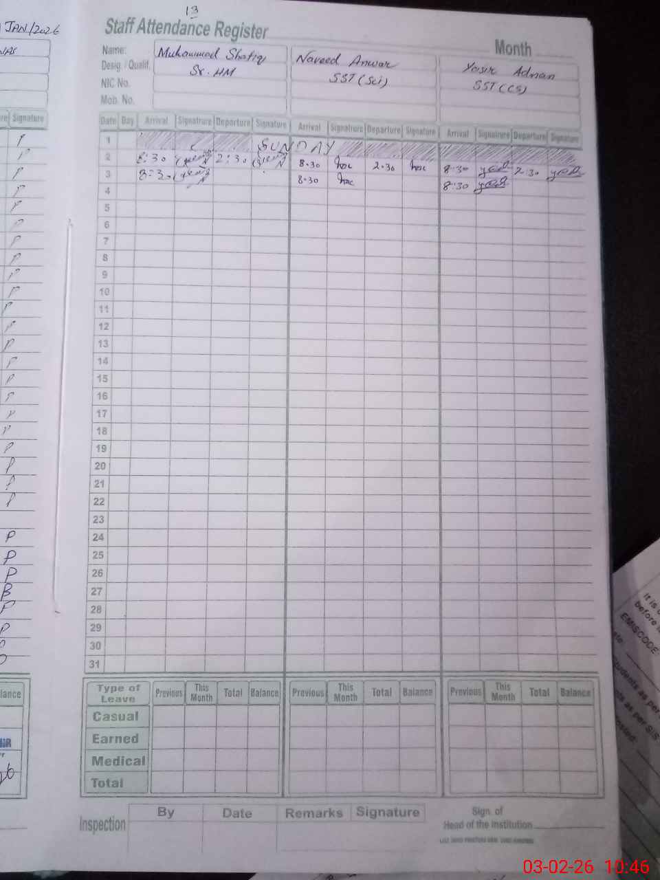 | 34**** | Sa**** Ma**** Za**** | EST English | Regular | 0 | 0 | 0 | 0 | 0 | 0 | 0 | 0 | 0 | Absent (Un-Authorized) |