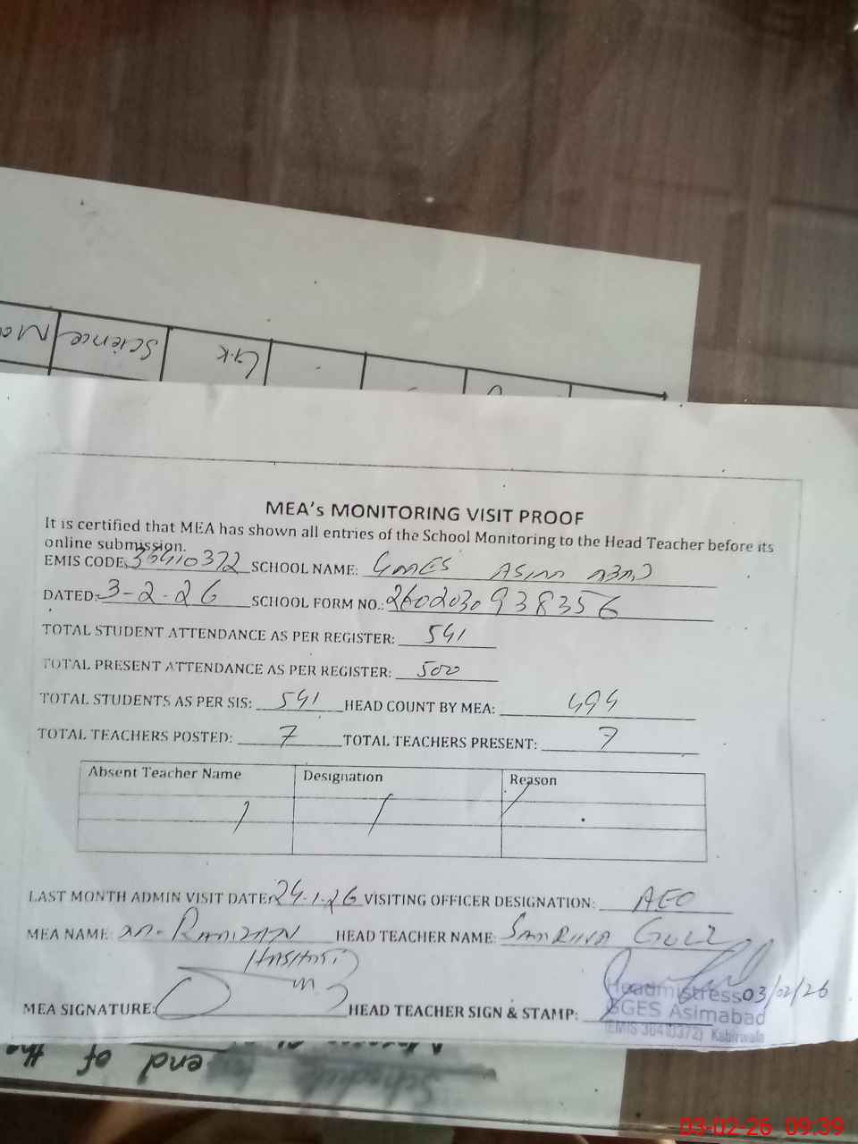 | Attendance Register | Head Teacher | MEA with School | Visit Proof |