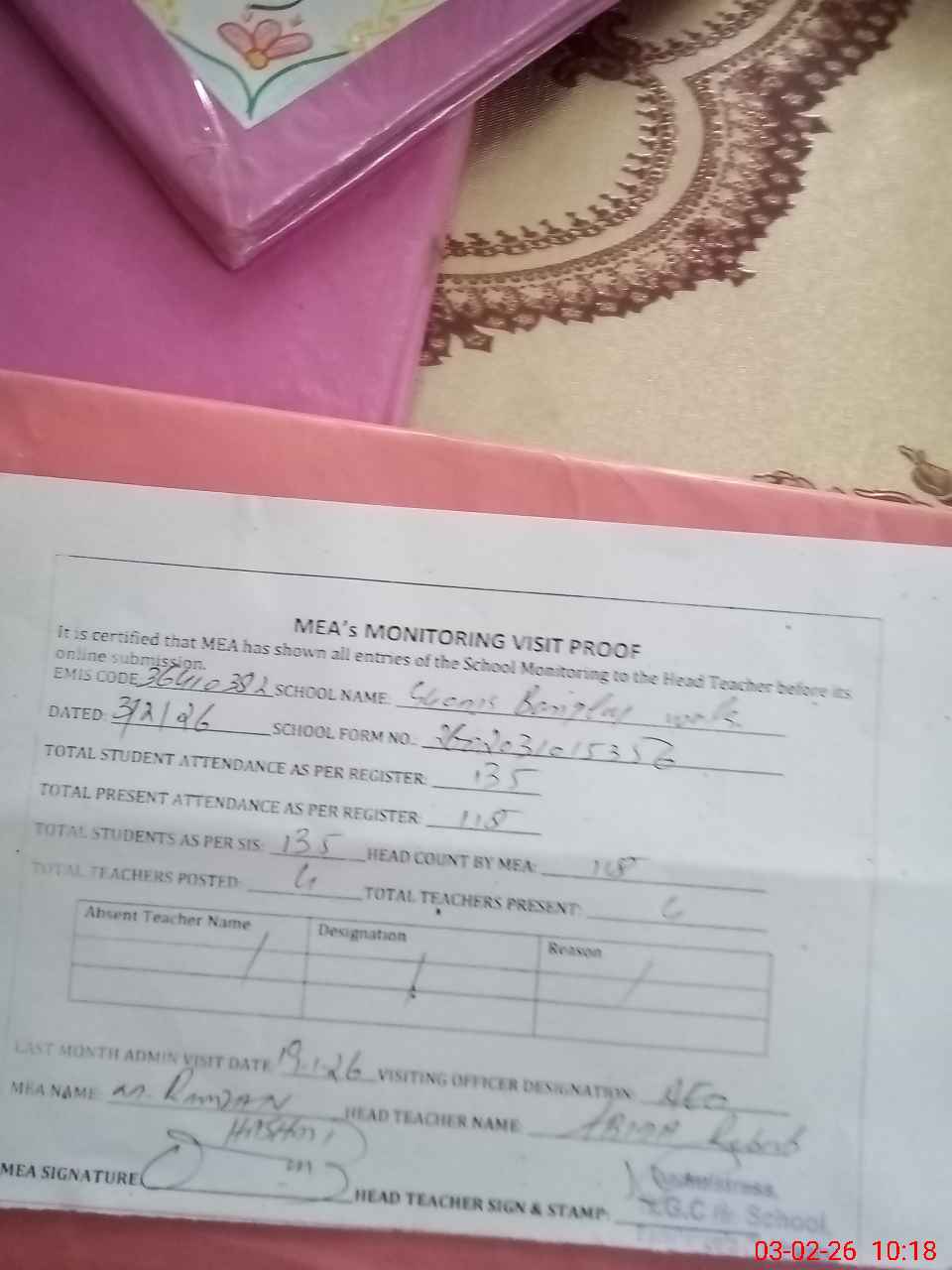 | EMIS Code: 36410382 | Name of School: GGCMS BANGLAY WALA, P/O KUKKAR HATTA, KABIRWALA | |||