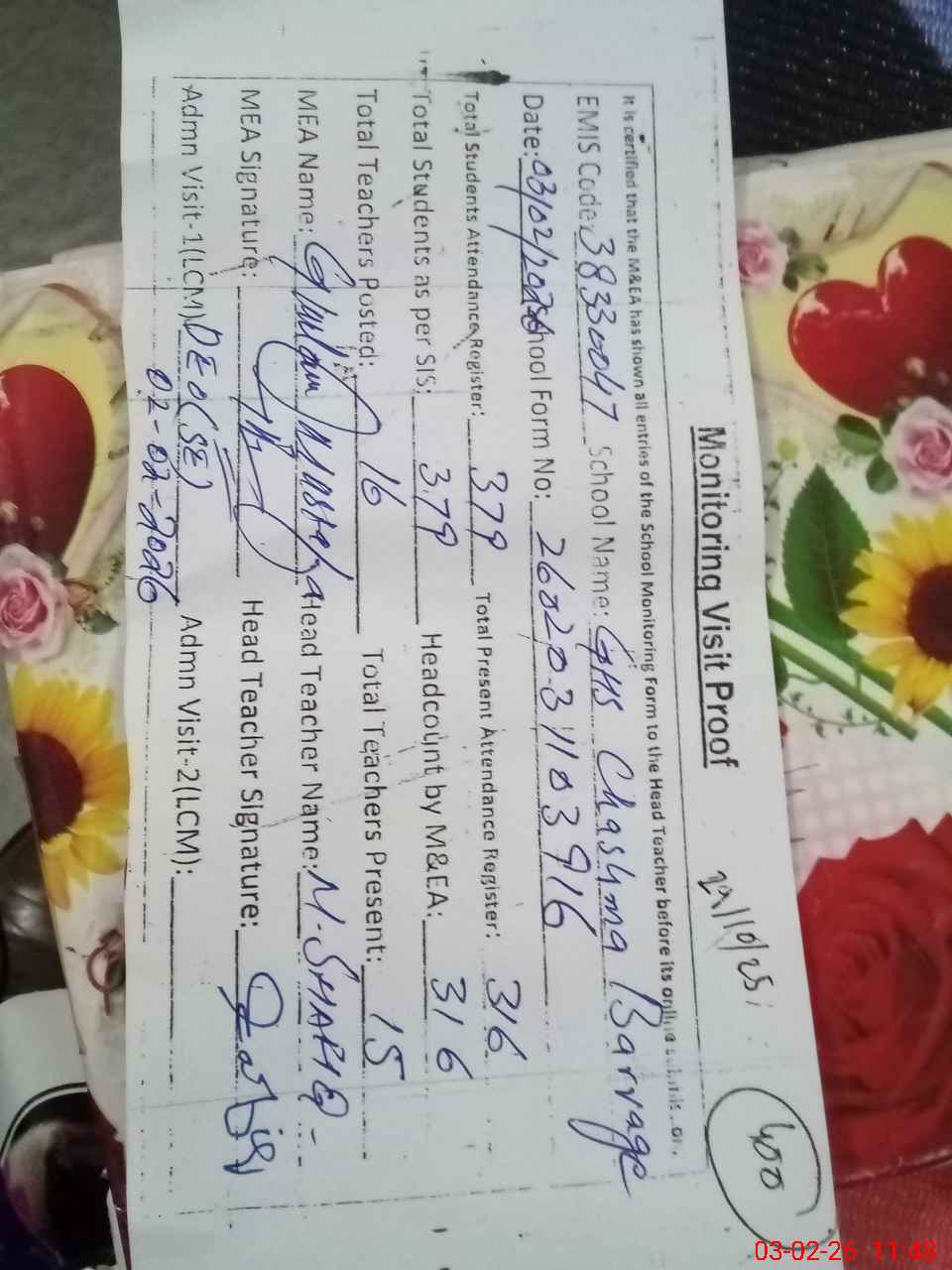 | Attendance Register | Head Teacher | MEA with School | Visit Proof |