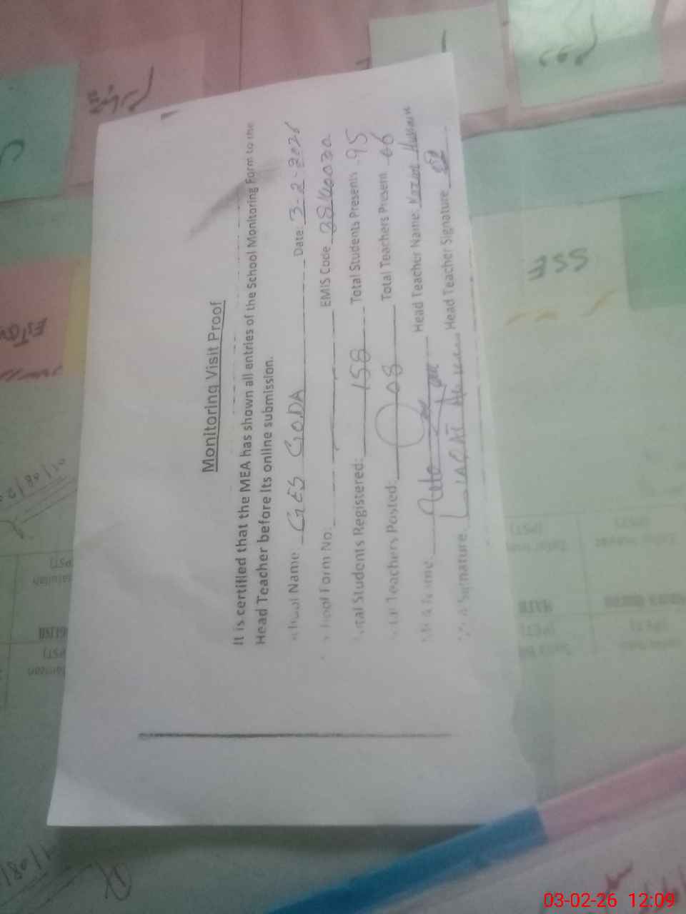 | Attendance Register | Head Teacher | MEA with School | Visit Proof |