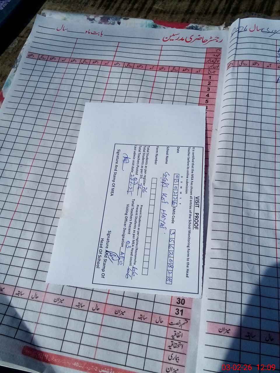| Attendance Register | Head Teacher | MEA with School | Visit Proof |