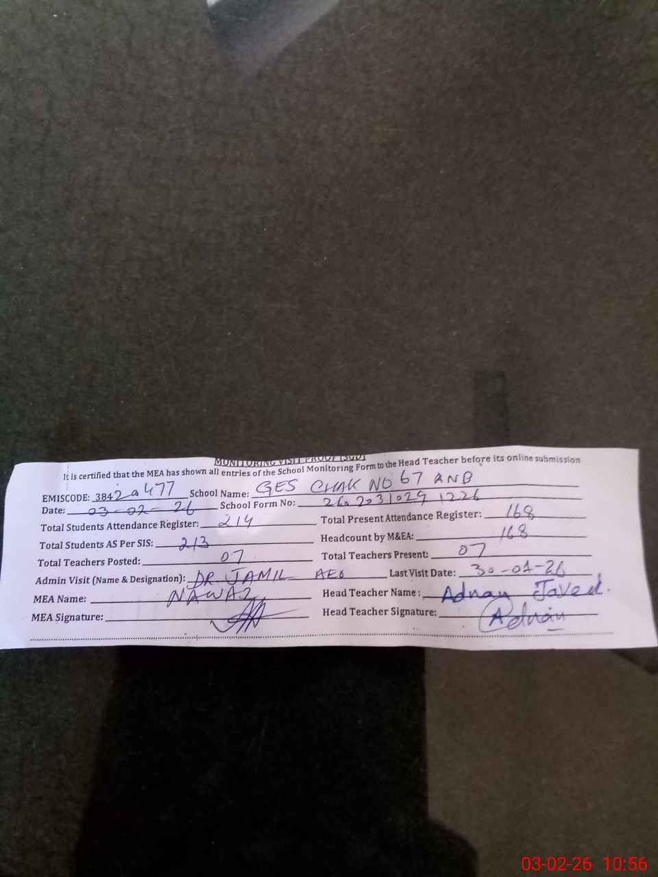 | EMIS Code: 38420477 | Name of School: GES CHAK NO.67 NB | |||