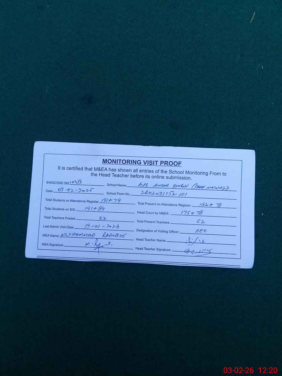 | Attendance Register | Head Teacher | MEA with School | Visit Proof |