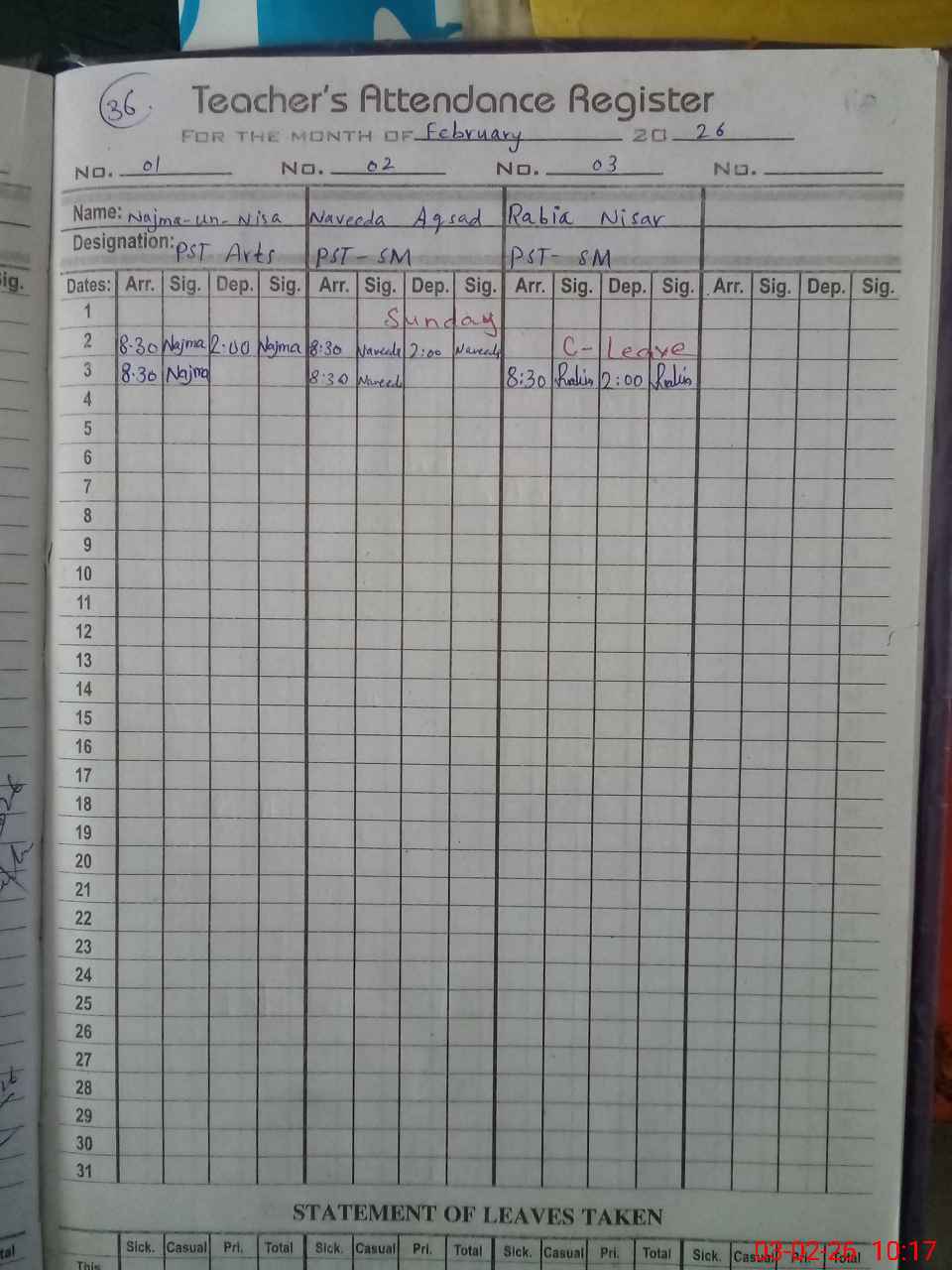 | Leave | Duty | Absent | Maternity | Medical | Ex- Pak |