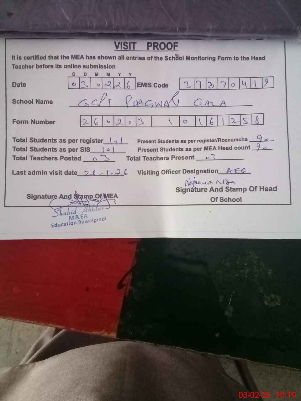 | Attendance Register | Head Teacher | MEA with School | Visit Proof |