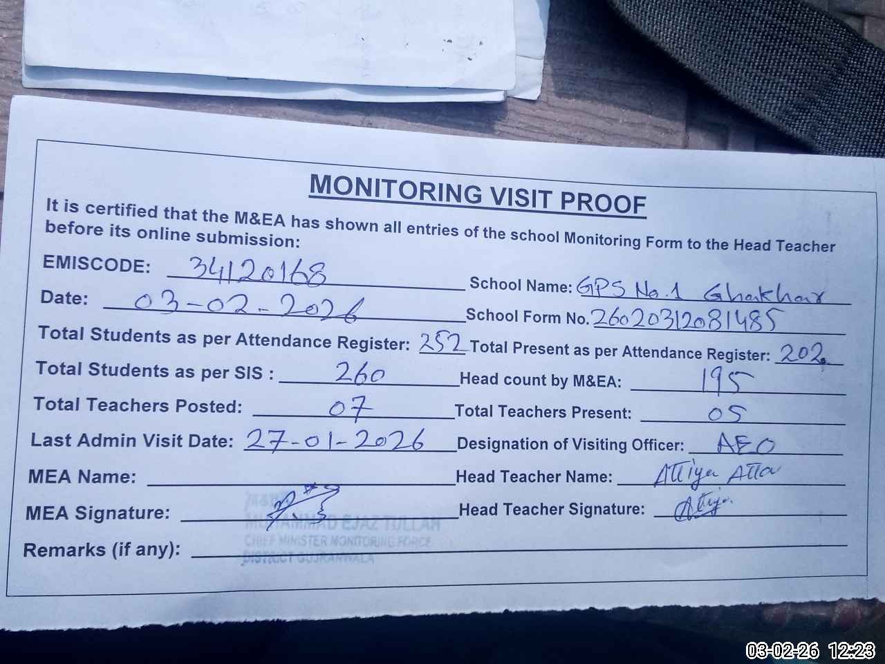 | EMIS Code: 34120168 | Name of School: GPS GHAKHAR NO.1 | |||