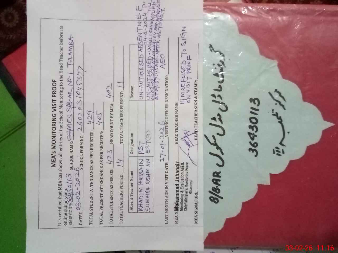 | Remarks (Use Separate Page if Required): KHADIM HUSSAIN PST FOUND UN AUTHORISED ABSENT FROM DUTY FROM 24 AUGUST 2024 TO TILL SUMAIRA REHMAN EST GENERAL ALSO FOUND UN AUTHORISED ABSENT FROM DUTY HER CASUAL LEAVE IS APPLIED ON 03 FEBRUARY 2026 AT 09 49 04 AM AND APPROVED BY HM AT 09 57 45 AM AFTER MEA VISIT START HER CASUAL LEAVE ON 02 FEBRUARY 2026 ALSO APPLIED AT 10 10 45 AM AND APPROVED BY HM AT 10 11 32 AM FTF RECORDS ARE NOT MAINTAINED BANK STATEMENTS ARE NOT AVAILABLE ONE TOILET FOUND LOCKED AND NON FUNCTONAL IN BOYS PORTION | |||||