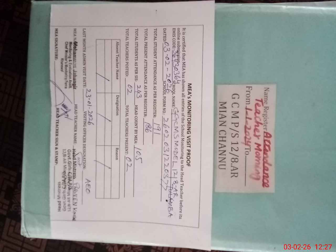| Attendance Register | Head Teacher | MEA with School | Visit Proof |