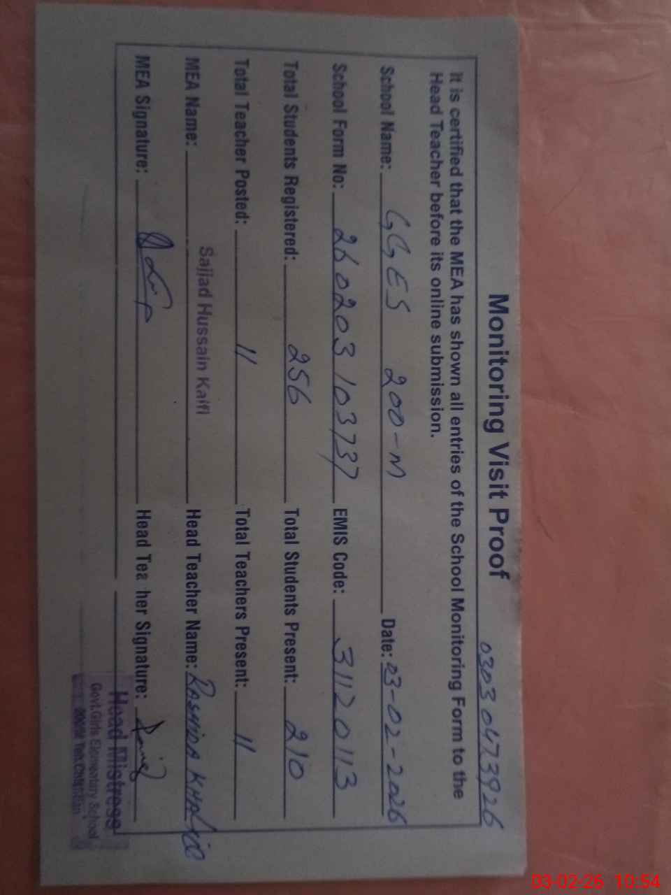 | Attendance Register | Head Teacher | MEA with School | Visit Proof |