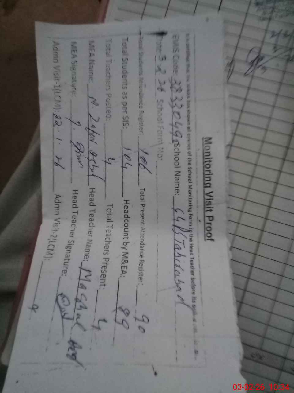 | Attendance Register | Head Teacher | MEA with School | Visit Proof |