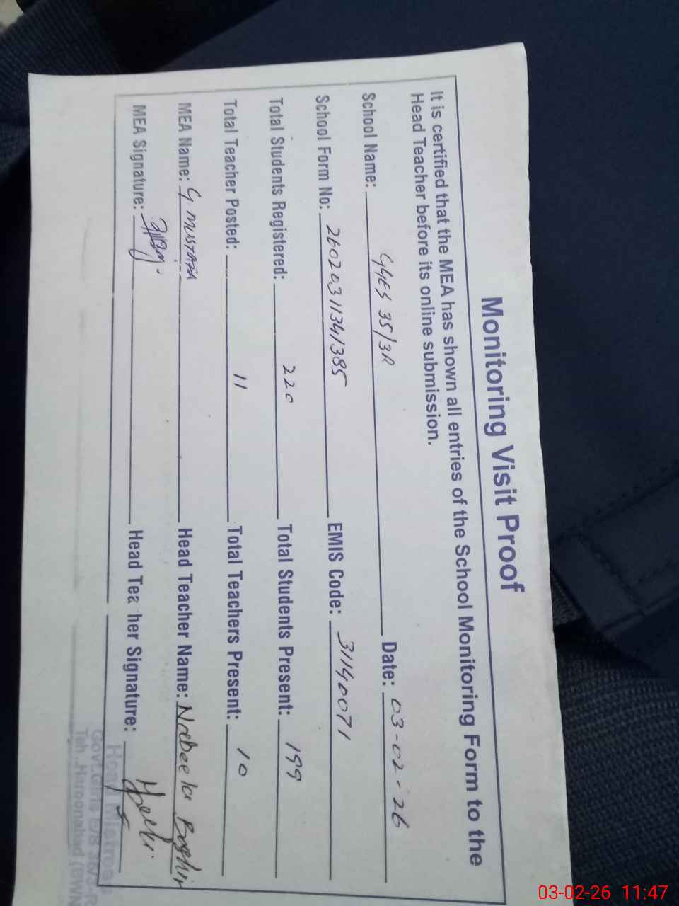 | Attendance Register | Head Teacher | MEA with School | Visit Proof |