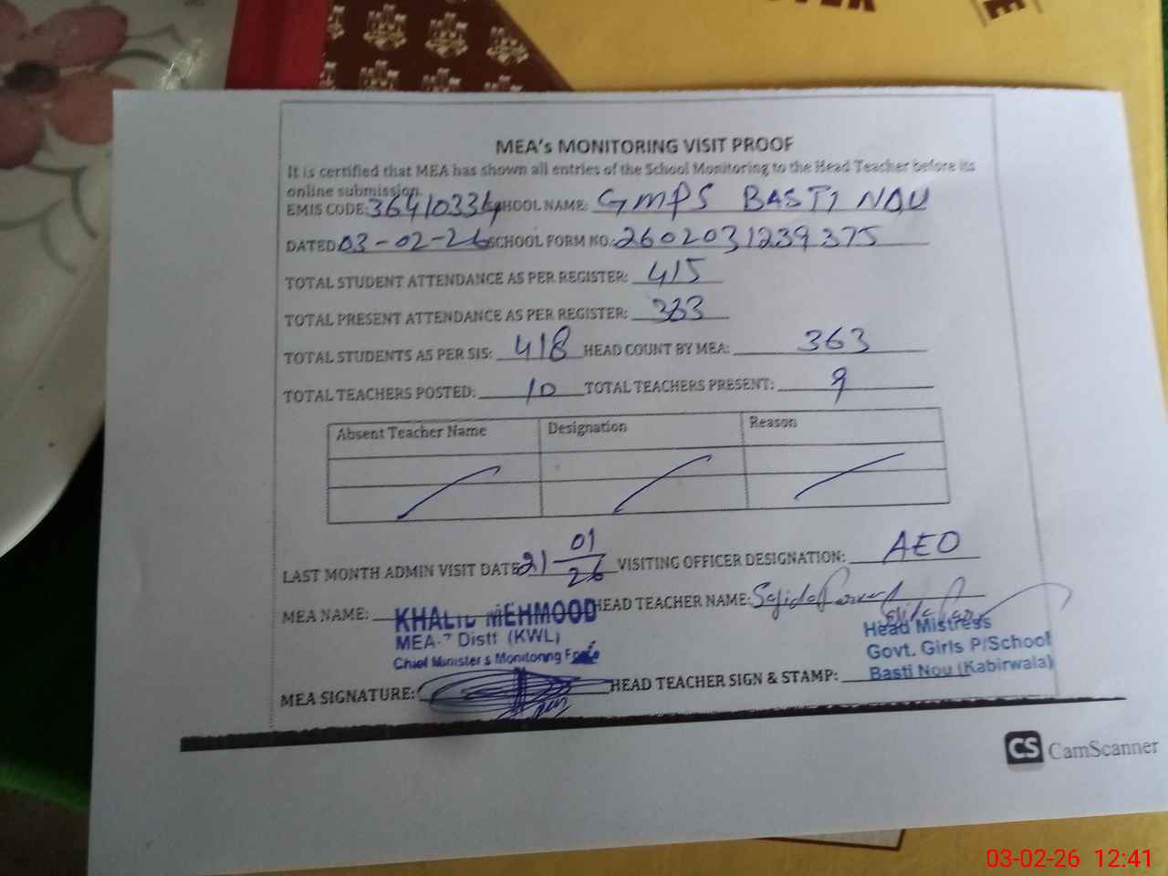 | Attendance Register | Head Teacher | MEA with School | Visit Proof |