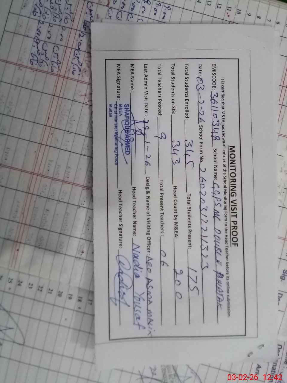 | Certified that this School was Inspected by the Undersigned MEA/DMO Today and the Information Stated Above is as Per Record. | |||||