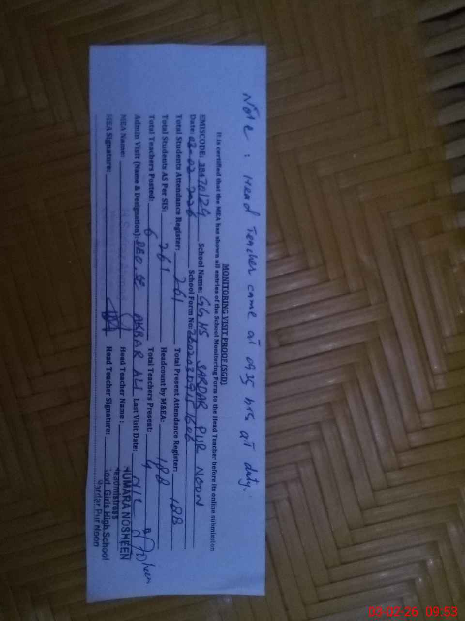 | Remarks (Use Separate Page if Required): Humara Nosheen SSE came at 0935 hrs in school so she is marked as unauthorized absent according to SOP | |||||