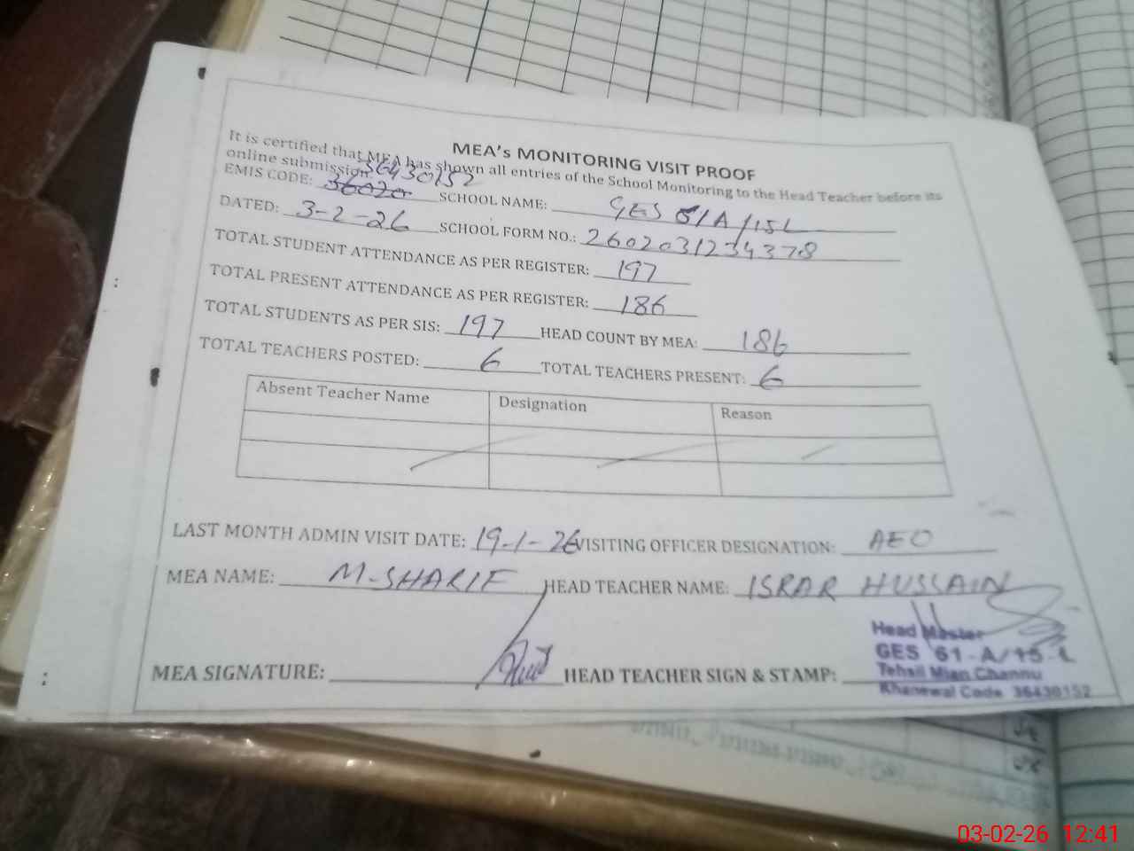 | Attendance Register | Head Teacher | MEA with School | Visit Proof |