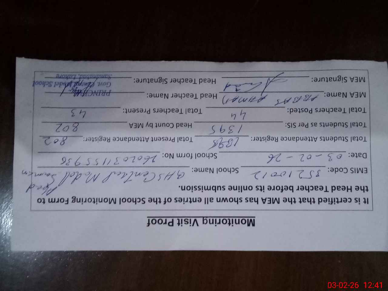 | Attendance Register | Head Teacher | MEA with School | Visit Proof |
