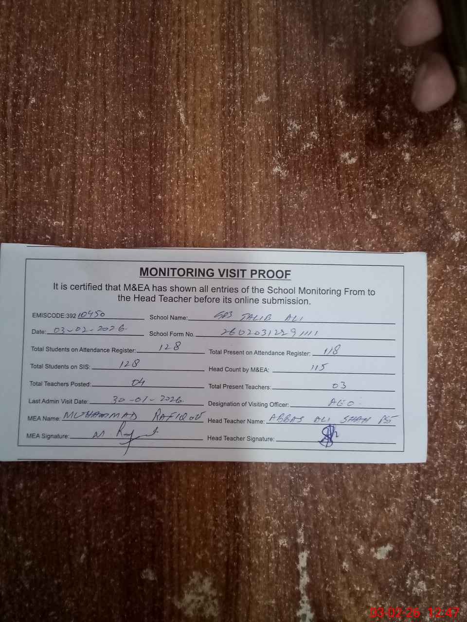 | EMIS Code: 39210450 | Name of School: GPS TALIB ALI P/O 26 S.P | |||