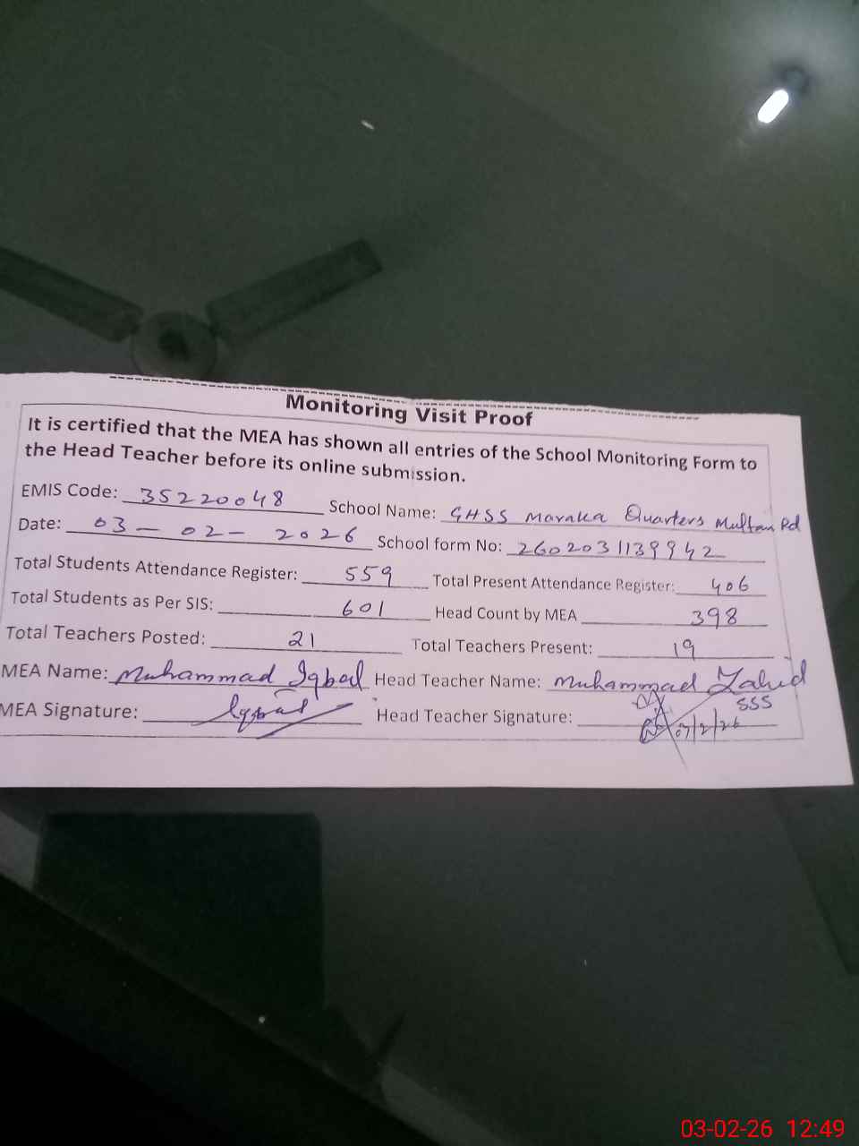 | EMIS Code: 35220048 | Name of School: GHSS MARAKA QUARTERS MULTAN ROAD | |||