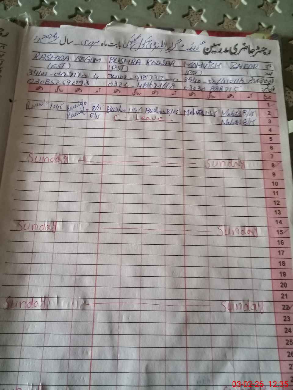 | CNIC | Full Name | Designation | R/C | Absence During Last Calender Month |