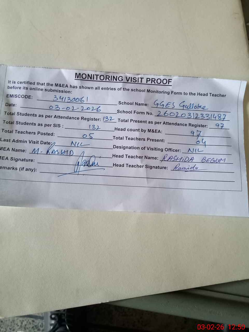 | Attendance Register | Head Teacher | MEA with School | Visit Proof |